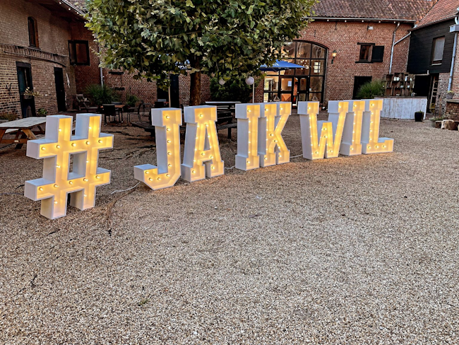 Handgemaakt in Limburg, dat zijn onze luxe verlichte letters & tekens. Mooi om uw droomlocatie nog nét die extra finishing touch te geven. Menig (trouw)fotograaf smult van onze producten omdat ze o.a. een prachtig fotopunt creëren voor u en uw gasten. Nieuwsgierig naar de mogelijkheden? Wij nemen graag de tijd om naar uw plannen te luisteren.